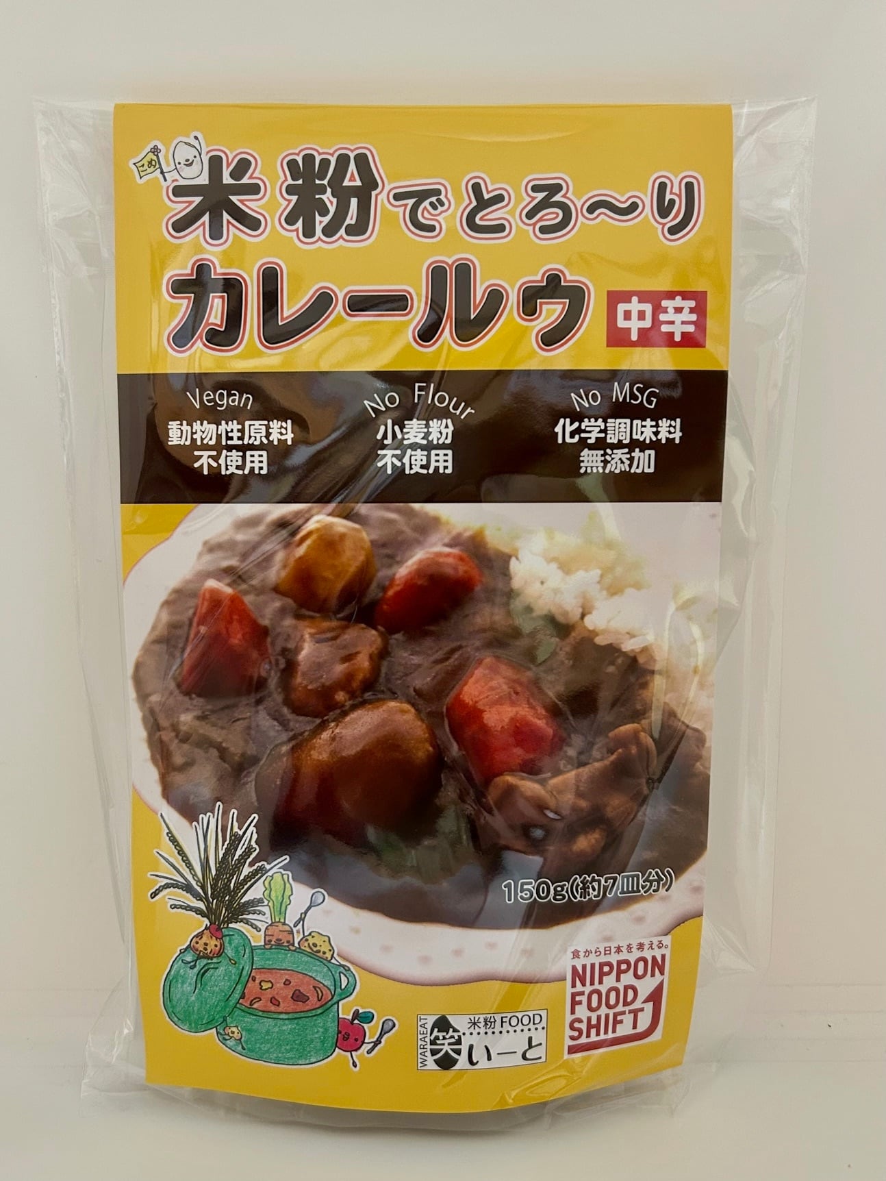 小麦粉のかわりに福島県産米粉でとろみをつけた使いやすいフレークタイプのカレールゥ。動物性原料や化学調味料無添加の後味軽いカレーです。